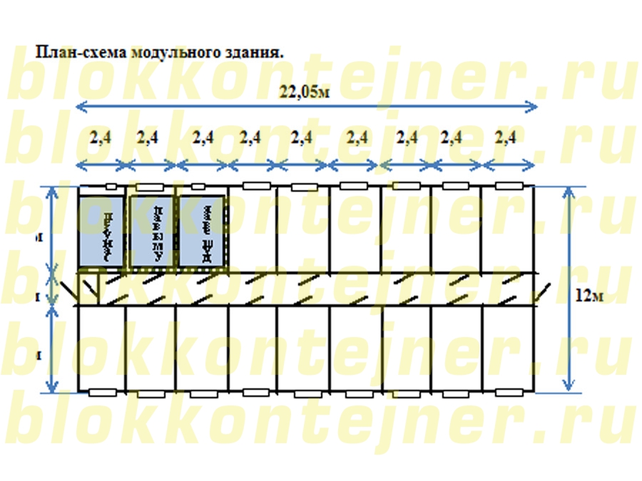 Модульное здание «Общежитие на 60 человек» в 1-этаж, размер (22,05 *12,0*2,5м)